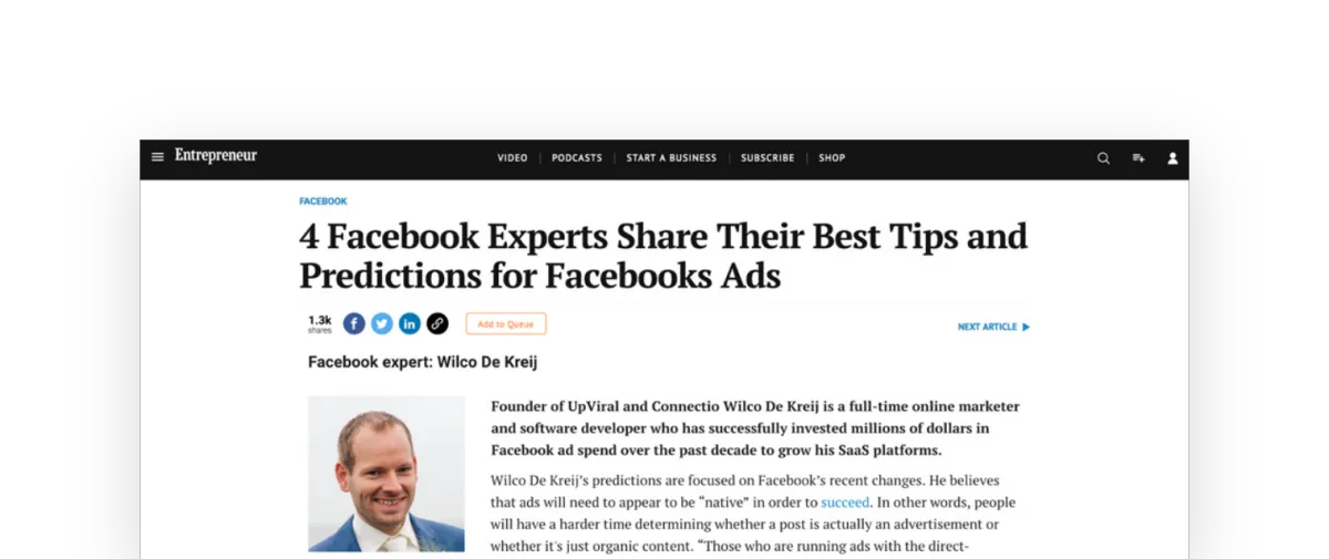 Connectio was particularly relevant to this story—it was a platform that helped Facebook advertisers get better results, serving over 10,000 customers including industry leaders like Russell Brunson and Ryan Deiss. Entrepreneur.com even featured me as one of their Facebook ad experts.
